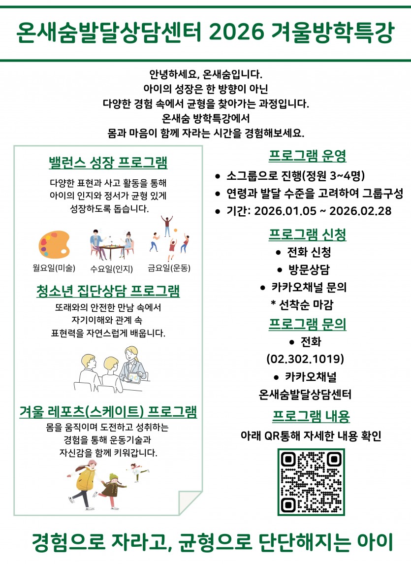 온새숨발달상담센터의 2026 겨울방학특강은 장애아동 및 발달 지연 아동이 비교 없이 자신의 속도로 성장할 수 있도록 설계된 프로그램입니다. 미술·인지·운동을 연결한 균형 성장, 관계를 연습하는 청소년 집단상담, 신체 활동으로 자신감을 키우는 겨울 레포츠까지 소그룹 환경에서 아이의 가능성을 키워갑니다. 이번 겨울방학, 아이의 속도를 존중하는 시간을 온새숨과 함께하세요. 자세한 내용 http://onsaesum.com/bbs/board.php?bo_table=sub0503&wr_id=5 |