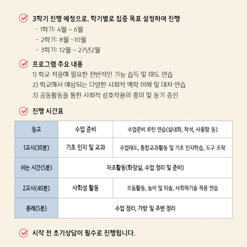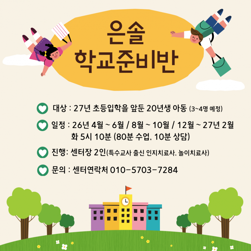 은솔에서 2027년 초등입학 예정인 아동을 대상으로 학교준비반을 개설합니다. 은솔 학교준비반은 특수교사 출신 인지치료사와 놀이치료사인 센터장 2인이 협업하여 진행합니다. 또한 1년동안 총 3학기 진행 예정으로, 각 학기별로 그룹별 집중 목표를 설정하여 운영됩니다. 1학기: 4월 ~ 6월 2학기: 8월 ~ 10월 3학기: 12월 ~ 27년 2월 4월부터 진행 될 1학기는 기본적인 학교 생활 적응을 위한 기능과 사회적 상황 이해와 또래관계의 긍정적 동기 증진에 초점을 두고자 합니다. 1. 전반적인 학교 생활에 대한 루틴을 알고 학교생활 적응에 필요한 기초 인지를 연습합니다. 2. 모둠활동, 규칙이 있는 놀이활동 등 개정 통합교과의 목표 및 내용을 바탕으로사회적 기술을 적용하고 연습합니다. 3. 학교 생활에서 예상되는 다양한 사회적 상황을 미리 경험하면서 상황(맥락)을 인식하고 대처하는 것을 연습합니다. 4. 친구들, 선생님 등 좀 더 많은 대인 자극을 동시에 처리하고, 흥미 증진을 통한 긍정적인 내적 동기를 높이고자 합니다. 센터에서 구성·제작한 교재를 사용하며, 시작 전 초기상담은 필수로 진행됩니다. * 2026년 4월 시작(12회기) * 화요일 5시 10분~6시 40분 * 총 90분(80분 수업 후 10분 부모상담) * 신청 및 문의 : 010-5703-7284 |