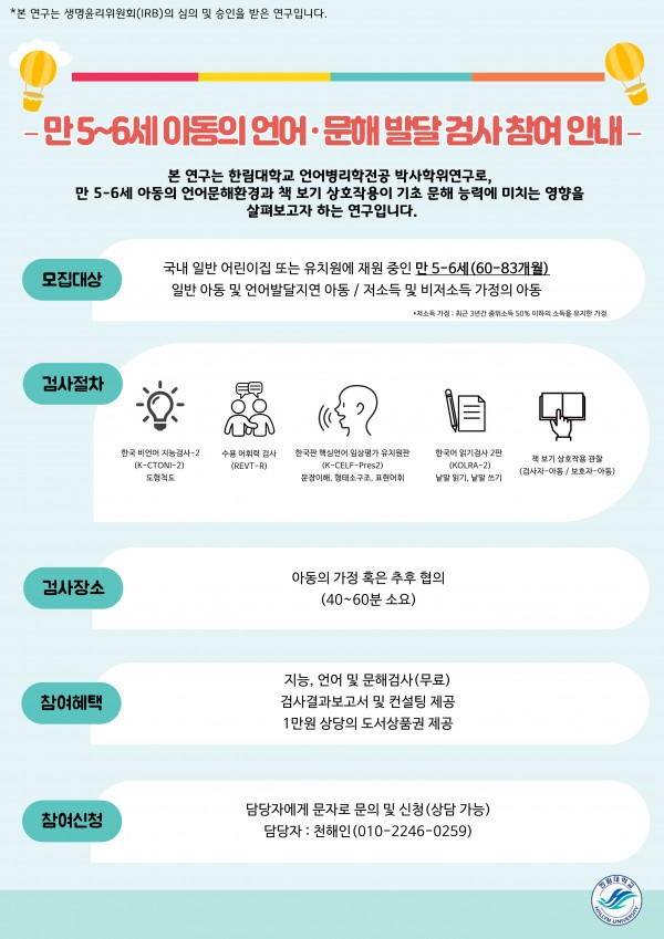 저는 한림대학교 일반대학원 언어병리청각학과에서 석박사통합과정을 수료한 언어재활사 천해인입니다. 현재 국내 일반 유치원 및 어린이집에 재원중인 2019-2021년생 아이들 대상으로 언어능력에 기반한 기초 문해 능력(읽기, 쓰기)을 살펴보고 관련 요인을 살펴보는 연구를 진행하고 있습니다. 따라서 본 연구에 참여해주실 대상 아동을 모집하고자 합니다. *본 연구는 생명윤리위원회(IRB)의 심의 및 승인을 받은 연구입니다. *연구명 : 언어.문해환경과 책 보기 상호작용이 만 5-6세 아동의 기초 문해 능력에 미치는 영향 : 소득 및 언어 수준을 고려하여 *연구 참여 대상 : [국내 일반 어린이집 / 유치원에 재원중인 2019-2021년생 아동] -언어발달지연아동 -저소득 가정 아동(최근 3년간 중위소득 50% 이하의 소득을 유지한 차상위계층 가정) *현재 언어재활 서비스를 받고 있는 아동도 연구에 참여가 가능합니다. *단, 지능의 어려움 및 기타 장애가 동반된 경우에는 대상자에서 제외됩니다. *검사 항목 -지능 : 한국 비언어 지능검사(K-CTONI-2)_도형척도 -어휘 : 수용 어휘력 검사(REVT-R) -언어 : 한국어 핵심언어 임상평가 유치원판(K-CELF-Pres2)_문장이해, 형태소구조, 표현어휘 -문해 : 한국어 읽기검사-2판(KOLRA-2)_낱말 읽기, 낱말 쓰기 -설문지 : 가정 내 언어문해환경 설문지 / 언어기반 문해기초 선별 체크리스트 -관찰 : 함께 책 보기 활동을 통한 부모-아동 상호작용 관찰(7분) / 검사자-아동 상호작용 관찰(7분) *검사 시간 및 장소 -소요 시간 : 40~60분 -장소 : 주로 아동의 가정에서 진행하고 있습니다. *참여 혜택 -무료 인지, 언어 및 읽기 검사 -검사 결과에 대한 결과보고서 및 컨설팅 -1만원 상당의 문화상품권 *개인정보보호 -연구 참여 과정에서 수집되는 개인정보는 연구목적으로만 사용되며, 모든 정보는 제 3자에게 제공되지 않습니다. |