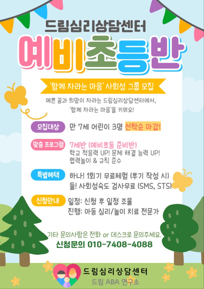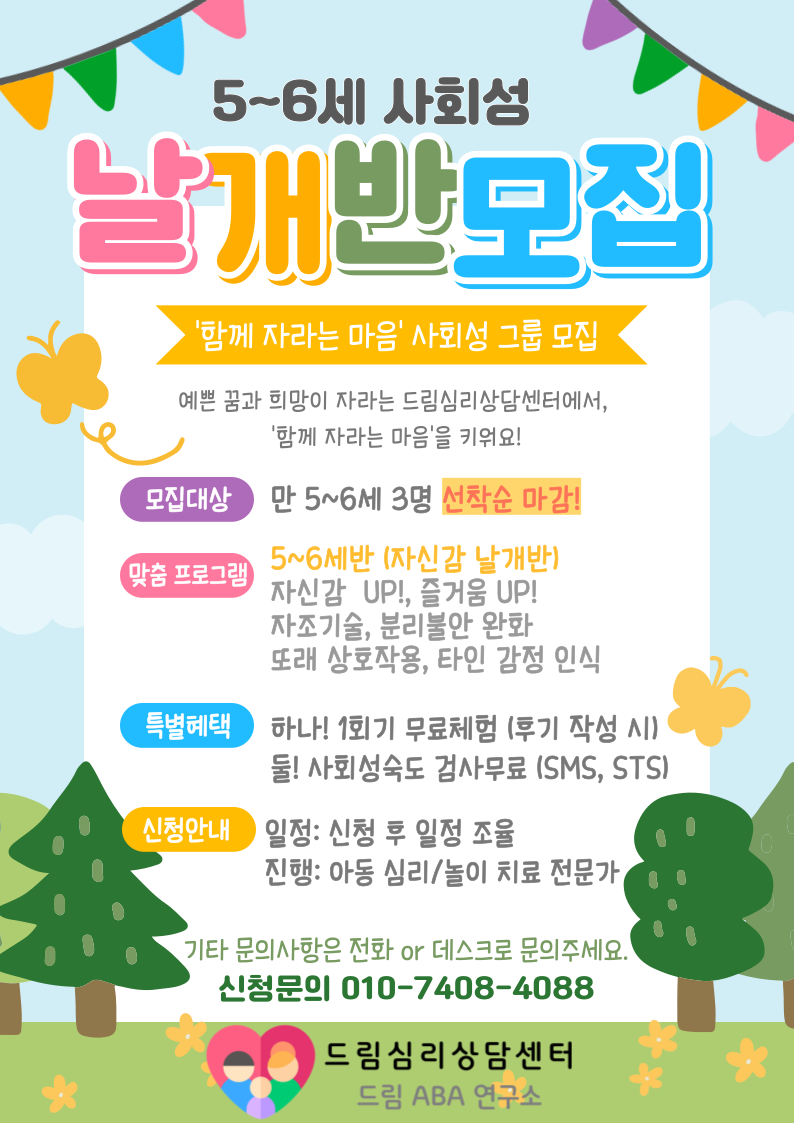 혹시 우리 아이가 또래 친구들과 어울리는 것을 어려워하거나, '엄마 없이는 아무것도 못 해'라며 여전히 엄마 품을 찾는 모습에 마음이 쓰이시나요? 유치원이나 어린이집 등원길에 힘들어하고, 스스로 밥 먹기, 옷 입기 같은 간단한 일조차 버거워하는 우리 아이를 보며, '언제쯤 혼자서도 씩씩하게 자랄까' 고민하셨을 부모님들을 위해 이 그룹을 마련했습니다. 이런 아이들에게 꼭 필요해요! (모집 대상) * 자조 기술 (Self-help Skills) 에 어려움을 보이는 4-5세 친구들: * 여전히 엄마에게 많이 의지하여 스스로 밥 먹기, 양치하기, 옷 입기 등에 어려움이 있는 아이. * 또래와의 상호작용에 어려움을 보이는 4-5세 친구들: * 친구들에게 다가가는 것을 망설이거나, 함께 놀이하는 방법을 잘 몰라 겉도는 아이. * 자기중심적인 놀이에서 벗어나지 못하고, 차례 지키기, 규칙 따르기 등을 어려워하는 아이. * 분리 불안이 높은 4-5세 친구들: * 유치원/어린이집 등원 시 엄마에게 안겨 가야 하거나, 엄마와 떨어지는 것에 힘들어하는 아이. 우리 그룹에서는 이런 것들을 함께 배웁니다. * 즐거운 놀이를 통한 사회성 증진: * 또래와 함께 놀며 '친구 관계 맺는 법'을 자연스럽게 익히고, 감정을 표현하고 조절하는 능력을 키웁니다. * 협동 놀이, 역할 놀이 등을 통해 규칙을 이해하고, 배려와 나눔을 경험합니다. * 스스로 하는 기쁨, 자조 기술 향상: * 먹기, 입기 등 일상생활 기술을 놀이와 연결하여 재미있게 연습하며, '나도 할 수 있다'는 자신감을 심어줍니다. * 긍정적인 분리 경험: * 안정적인 그룹 환경 속에서 엄마와 잠시 떨어져 지내는 연습을 통해 분리 불안을 완화하고, 기관 생활에 대한 적응력을 높입니다. 소수 정예 그룹 활동을 통해 아이 한 명 한 명에게 집중하여 맞춤형 상호작용을 제공하고, 아이들이 건강한 사회 구성원으로 성장할 수 있도록 전문 치료사가 돕겠습니다. [그룹 정보] * 대상: 한국나이5세 ~7세 친구들 * 정원: 3명 (소수 정예) * 장소: 드림심리상담센터 [무료 체험 이벤트] * 일시: 25년 11월 15일 (토) (시간은 개별 안내) * 혜택: 사회성 그룹 1회 무료 체험 * 신청: 선착순 5명 마감 우리 아이가 더 이상 움츠리지 않고, 세상 속으로 힘차게 나아갈 수 있도록 따뜻한 발판을 마련해 주세요. 부모님의 많은 관심과 신청을 기다립니다. 감사합니다. 드림심리상담센터 드림 |